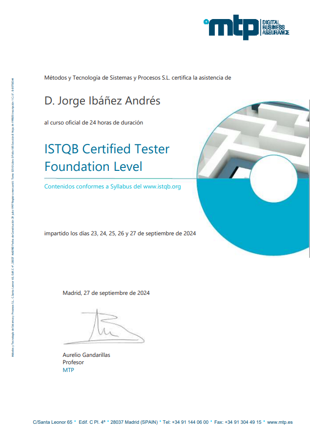 Curso de formación básica en el área de testing y calidad de software impartidas a través de la empresa «Métodos y Tecnología de Sistemas y Procesos S.L» , cuyo objetivo principal es proporcionar los procedimientos y métodos de mayor relevancia para aumentar la eficacia a la hora de gestionar, planificar, diseñar y ejecutar pruebas de software.